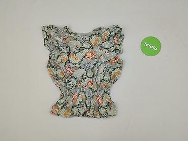 Bluzka damska z krótkim rękawem, wzór kwiatowy. - Krój: luźny, zaokrąglony dół, krótkie rękawy typu cap sleeves. - Dekolt: okrągły, z ozdobnym rozcięciem i zapięciem na guzik z tyłu. - Materiał: 1...