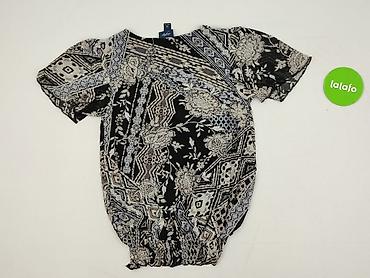 Bluzka damska z krótkim rękawem, rozmiar XL. - Krój: luźny, z dekoltem w serek zapinanym na guziki. - Wzór: białe tło w drobne czarne kropki z niebieskimi, graficznymi motywami/kwiatami. - Ma...