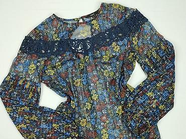 Damska bluzka z długim rękawem, rozmiar M - Fason: klasyczna bluzka z okrągłym dekoltem, długi rękaw - Wzór: duży, dekoracyjny nadruk kwiatowy w odcieniach granatu, bieli i szarości; ciekawy, asym...
