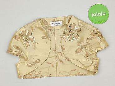Krótki damski bolerko/żakiecik bez zapięcia - Kolor: kremowy/ecru - Rozmiar z metki: 40 - Fason: krótkie bolerko z zaokrąglonymi połami z przodu, krótkie rękawy - Materiał: tkanina żakardowa z sub...