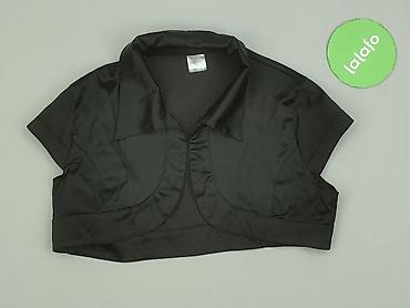 Krótki bolerko damskie - Kolor: czarny, lekko połyskujący - Krój: krótkie bolerko do połowy talii, półokrągłe poły bez zapięcia, podwyższona stójka/kołnierzyk - Rękaw: krótki - Materiał: gładka tk...