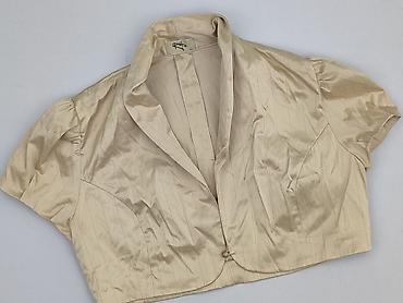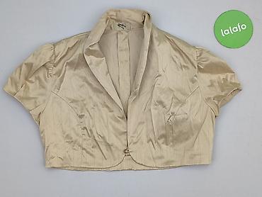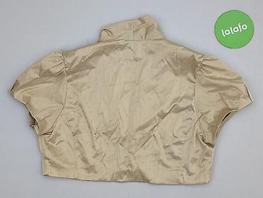 Satynowe bolerko damskie, krótkie, w kolorze szampańskim/ecru. - Krój: otwarte bolero z szerokim kołnierzem, krótkie rękawy, długość do talii. - Rozmiar z metki: 38. - Materiał: gładka, miękko u...