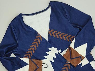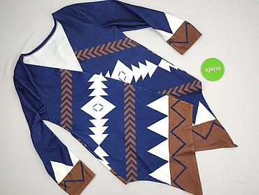 Kardigan damski z długim rękawem, bez zapięcia, z miękkim kołnierzem/szalowym wykończeniem z przodu. Wzór: etniczny/aztecki w odcieniach bieli, różu i ciemnej szarości, z pasami i rombami. Materi...