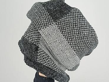 - Wzór i wykończenie: duże kwadraty/krata w odcieniach szarości i czerni; różne sploty dzianiny tworzą efekt patchworku; wywinięte, dzianinowe lamówki przy przodach, mankietach i dole