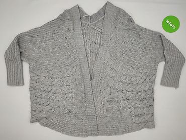 Szary kardigan damski TATUUM, rozmiar M. - Krój: krótki, luźniejszy, z obniżoną linią ramion i krótkim rękawem - Zapięcie: na duże guziki z przodu - Wzór/struktura: delikatna, geometryczna faktura...