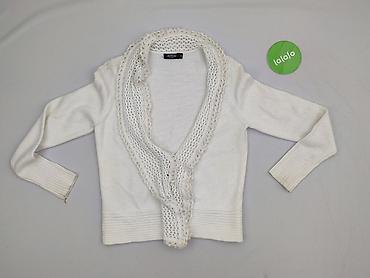 Biały damski sweter/bolerko MON ROW, rozmiar M. - Fason: kopertowy, zapinany/przekładany z szeroką listwą przy przodzie - Rękaw: długi, mankiety z prążkowaną dzianiną - Dekolt: szeroki, układa się...