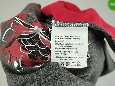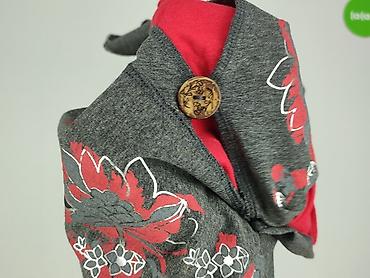 Damski kardigan z krótkim rękawem 3/4 w odcieniu grafitowym z czerwonym topem-wstawką. Przód zdobi efektowny, kwiatowy nadruk w czerwieni, bieli i szarości oraz dekoracyjny drewniany guzik przy dekolcie V. Miękka, elastyczna dzianina – skład: 65% bawełna, 35% poliester; wstawka: 100% bawełna. Długość za biodra, swobodny fason, gładki tył.