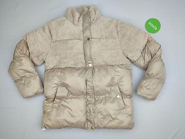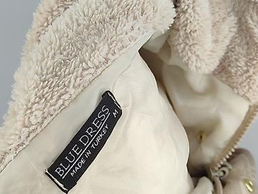 Damska kurtka puchowa BLUE DRESS, rozmiar M, wyprodukowana w Turcji. Dwumateriałowa: górny panel oraz kołnierz z miękkiego, pluszowego „baranka”, dolna część i rękawy z lekko połyskującej tkaniny. Kolor beżowy/ecru.