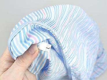 - Wzór: cienkie pionowe paski w odcieniach błękitu, bieli i jasnego różu