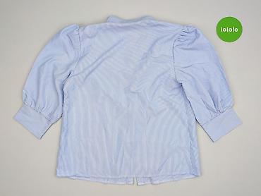 Damska koszula z krótkim rękawem, w drobne błękitno-białe paski. - Krój: taliowana, zapinana na guziki z przodu - Rękawy: krótkie, z marszczeniem na ramionach i mankietem zapinanym na guziki - Koł...