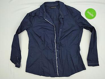 Granatowa koszula damska z długim rękawem, rozmiar XL. - Fason: klasyczny, prosta linia - Kołnierzyk: szeroki, z dekoracyjnymi, subtelnymi wstawkami/haftem - Zapięcie: guziki ukryte pod listwą (gł...
