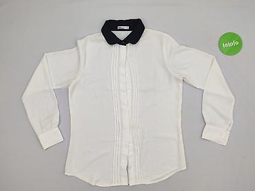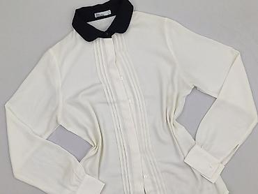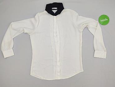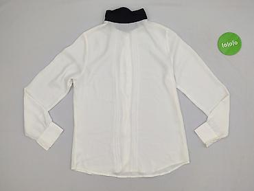 Damska koszula z długim rękawem, rozmiar M. - Kolor: ecru/śmietankowy z kontrastowym czarnym kołnierzem. - Fason: lekko taliowana, zaokrąglony dół. - Zapięcie: listwa z guzikami ukryta pod pl...Rozmiar: