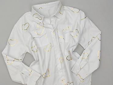 Koszula damska z lekkiego, półprzezroczystego szyfonu. - Kolor: biel z nadrukiem serc w odcieniach niebieskiego i jasnoszarego (motyw w drobne cętki). - Krój: swobodny, prosty, z delikatnymi zakł...