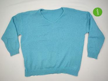 Sweter damski, turkusowy, z dekoltem w serek. - Fason: luźny, lekko oversize, opuszczona linia ramion, rękaw 3/4. - Dzianina: miękka, puszysta faktura o drobnym splocie; ściągacze na dole i przy m...