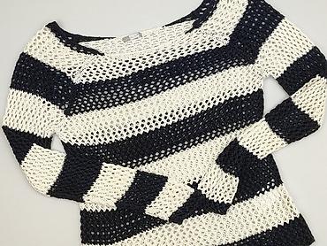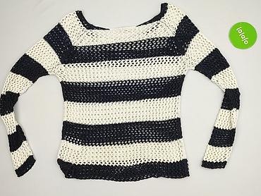 Damski sweter dzianinowy w szerokie pasy - Krój: luźny, lekko skrócony, z opuszczoną linią ramion - Rękaw: 3/4 - Wzór: szerokie poziome pasy w kolorach czerni i bieli - Dzianina: ażurowa/siateczko...Stan: