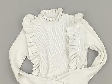 Biała, prążkowana bluzka/sweter damski z długim rękawem. Delikatnie dopasowany krój, miękka dzianina o drobnym, pionowym ściągu podkreślającym sylwetkę. Ozdobne aplikacje z drobnych, srebrzystych d...
