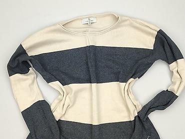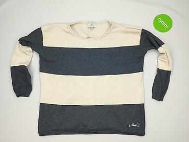 Sweter damski w pasy, rozmiar M - Krój: klasyczny, z okrągłym dekoltem - Wzór i kolory: poziome pasy w odcieniach szarości, kremu i brązu; drobne ażurowe prześwity między pasami - Materiał: 100% p...