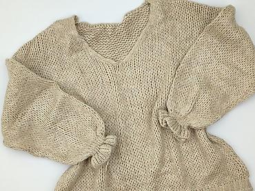 Beżowy sweter damski z dekoltem w serek - Krój: luźny, opuszczona linia ramion - Rękawy: długie - Dekolt: V-neck - Dół: delikatnie zaokrąglony z przodu i z tyłu - Tkanina: miękka, dzianinowa o dro...Stan: