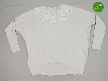 Sweter damski oversize w kolorze jasnej bieli/ecru. Miękka, prążkowana dzianina o drobnym, elastycznym ściągaczu na całej powierzchni. Dekolt okrągły z bogatą, koronkową aplikacją paisley z doszytymi perełkami i koralikami – dekor podkreśla górę sylwetki. Rękawy długie, opuszczona linia ramion. Dół asymetryczny (wydłużony przód i tył z delikatnym szpicem), co wysmukla i dodaje lekkości. Idealny do legginsów lub rurek; sprawdzi się w stylizacjach casual i eleganckich.