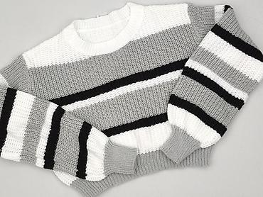 Sweter damski, rozmiar S - Fason: klasyczny sweter z okrągłym dekoltem, długie rękawy - Wzór/kolor: połączenie szerokich pasów w odcieniach niebieskiego i jasnoszarego, górna część w panterkę (cza...Rozmiar: