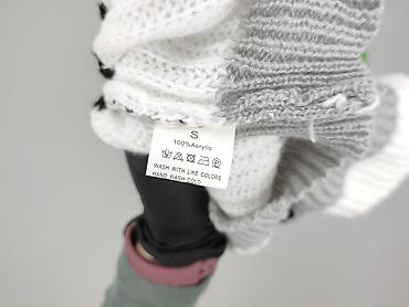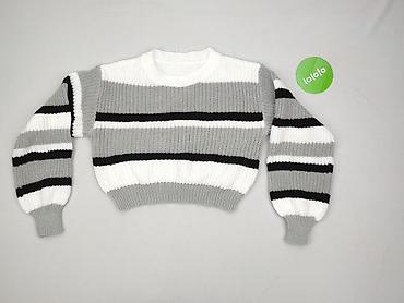 Damski sweter w paski z kieszenią - Rozmiar: S (z metki) - Skład: 100% akryl - Krój: klasyczny, okrągły dekolt - Wzór i kolory: biało-czarna baza w wąskie poziome paski; rękawy asymetryczne – jede...
