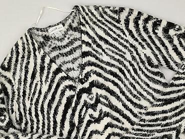 Damski sweter w paski z kieszenią - Rozmiar: S (z metki) - Skład: 100% akryl - Krój: klasyczny, okrągły dekolt - Wzór i kolory: biało-czarna baza w wąskie poziome paski; rękawy asymetryczne – jede...