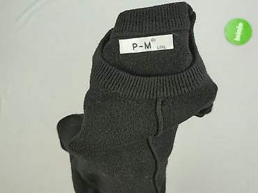 Czarny sweter damski P-M, rozmiar z metki L/XL. Klasyczny krój z okrągłym dekoltem, długim rękawem i elastycznymi ściągaczami przy mankietach oraz u dołu. Na piersi naszyta ozdobna kieszonka z dodatkową klapką. Z przodu pionowy, dekoracyjny szew biegnący przez środek.