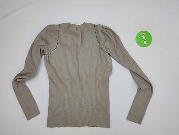 Sweter damski, beżowy, dzianinowy. - Krój: prosty, z lekko obniżoną linią ramion; długie rękawy z szerokimi ściągaczami. - Dekolt: łagodnie zaokrąglony. - Materiał: średniej grubości, miękka dzian...