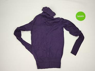 Fioletowy sweter damski z golfem - Fason: dopasowany, prążkowany splot - Dekolt: wysoki golf, elastyczny i miękki - Rękawy: długie - Materiał: dzianina elastyczna (przyjemna w dotyku, dobrze się r...