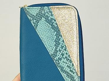 - Kolor: turkus/teal z trójkątnymi wstawkami – połyskujące złoto oraz panel o fakturze skóry węża w odcieniach miętowo‑turkusowych