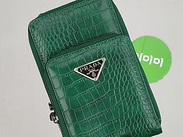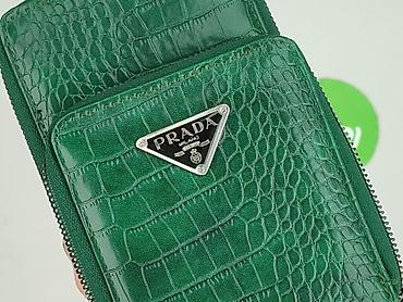Portfel/mini torebka damska w odcieniu butelkowej zieleni, z tłoczeniem imitującym skórę krokodyla. Na froncie metalowe trójkątne logo PRADA w kolorze srebrnym.