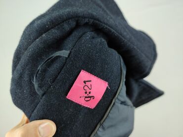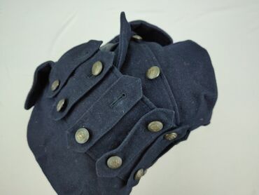 Płaszcz damski, ciemnogranatowy/czarny, o długości do połowy uda. - Krój dwurzędowy z efektowną, asymetryczną klapą i wysoką stójką/kołnierzem. - Zapięcie na ozdobne, metaliczne guziki (złoty poł...