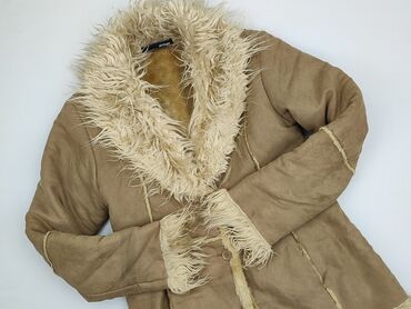 Damska kurtka z kożuchem sztucznym – brązowa - Fason: dopasowany, dwurzędowy - Materiał: 100% poliester (miękka, zamszowa w dotyku tkanina na zewnątrz; wewnątrz i kołnierz z puszystego beżowego „b...