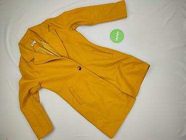 Żółty damski płaszcz wełniany z podszewką - Rozmiar: EU 40 (UK 12) – metka na zdjęciu - Krój: krótki, lekko rozkloszowany, stójka - Zapięcie: duże guziki z przodu (asymetryczne ułożenie), pasek z ...Stan: