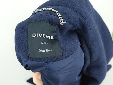 Płaszcz damski Diverse, rozmiar L, z domieszką wełny (Wool blend). Klasyczny, granatowy, z kołnierzem z klapami i wiązanym paskiem w talii. Zapinanie/wiązanie na pasek podkreśla sylwetkę i pozwala regulować dopasowanie. Dwie duże naszywane kieszenie z klapami z przodu. Gładka podszewka zwiększa komfort noszenia. Długość do połowy uda – idealny na sezon przejściowy i chłodniejsze dni. Uniwersalny, elegancki fason pasuje zarówno do stylizacji casualowych, jak i biurowych. Marka na metce: DIVERSE, Size L, Wool blend. Kolor: granat. Dla: kobieta. Stan: używany.