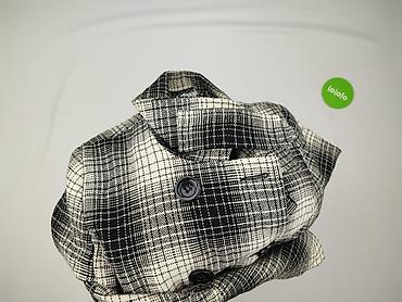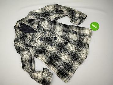 Płaszcz damski AMISU, rozmiar 40. - Krój: dwurzędowy trencz z szerokimi klapami - Wzór: pepitka w odcieniach czerni, bieli i szarości, pionowe pasy optycznie wysmuklające sylwetkę - Zapięcie: podw...