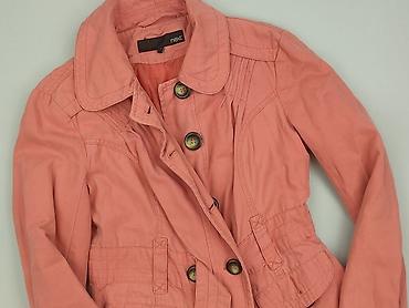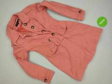Beżowy trencz damski, rozmiar S - Klasyczny, dwurzędowy fason z kołnierzem - Regulowane patki przy mankietach - Kieszenie boczne - Pasek/szlufki w talii (widoczne szlufki) - Długość za biodra – zg...