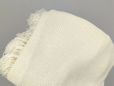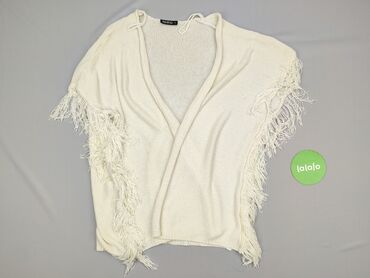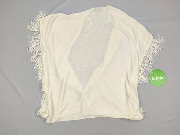 Kardigan/ponczo Janina, rozmiar 42 - Fason: narzutka bez zapięcia, luźny krój - Długość do bioder z frędzlami przy dolnej krawędzi - Rękawy długie - Wzór: czarno‑biały, geometryczny/pleciony efekt...Stan:
