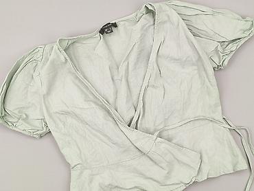 - Fason: dekolt w kształcie V, kopertowe zapięcie/wiązanie, krótki rękaw bufkowy, lekko marszczony dół z tunelikiem