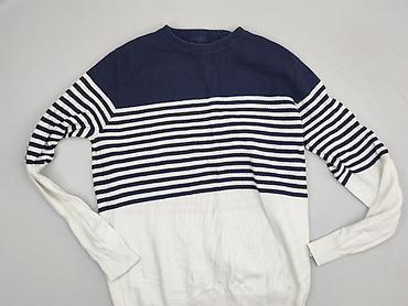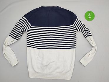 Sweter damski Pull&Bear, rozmiar S (EU/MEX S/26). - Model: dzianinowy, długie rękawy, poziome szerokie pasy w kolorze granatowym i kremowym - Splot: wyraźna struktura o splocie warkoczowym/geometr...