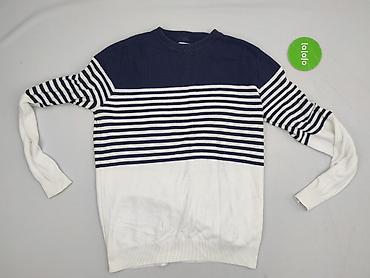 Sweter damski Pull&Bear, rozmiar S (EU/MEX S/26). - Model: dzianinowy, długie rękawy, poziome szerokie pasy w kolorze granatowym i kremowym - Splot: wyraźna struktura o splocie warkoczowym/geometr...Rozmiar: