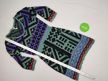 - Kolorystyka i wzór: geometryczny, etniczny print w czerni, zieleni i fiolecie z czerwonym akcentem na mankietach i dole