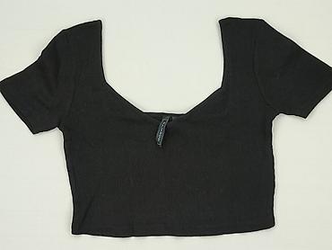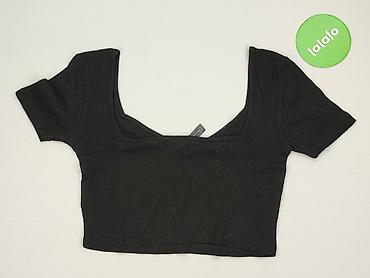Czarna bluzka krótsza (crop top) FB Sister, rozmiar S. - Fason: prążkowana, dopasowana, z okrągłym dekoltem - Krótki rękaw - Z tyłu wiązanie na troczki - Materiał: 95% bawełna, 5% elastan – elastyc...