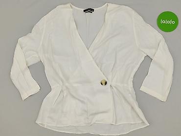 Bluzka damska, biała, rozmiar XL. - Krój: luźny, odcinana w talii z delikatnym marszczeniem; tył nieco dłuższy (asymetryczny dół). - Dekolt: okrągły. - Rękawy: krótkie, z dekoracyjną patką i metal...