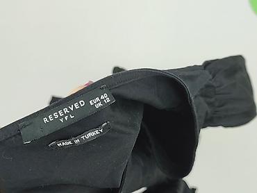 Bluzka damska Reserved YFL - Model: lekka, zwiewna bluzka z falbaną u dołu - Kolor: ciemna z drobnym, srebrzystym wzorem - Fason: długi rękaw, lekko bufowane ramiona; stójka z delikatną falbanką; ...