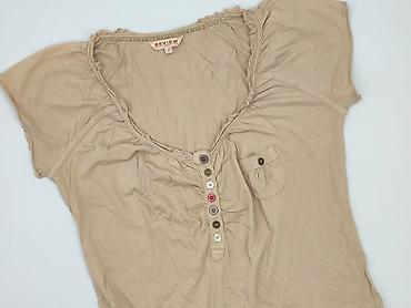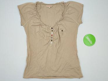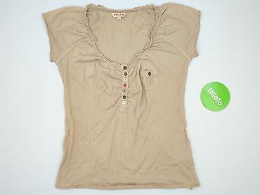 Bluzka damska La Blanche, rozmiar 36. - Kolor: beżowy, rękawy z białą wstawką - Fason: krótki rękaw z falbaną, okrągły dekolt - Materiał: 70% wiskoza, 30% poliester (metka widoczna na zdjęciu) - D...