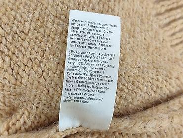 - Skład materiału (metka): 73% akryl, 13% poliamid, 12% poliester, 2% włókno metalizowane.