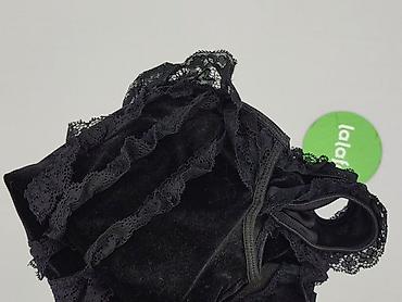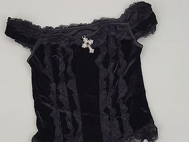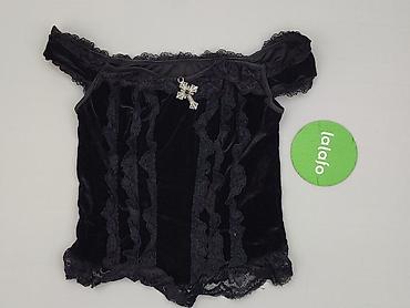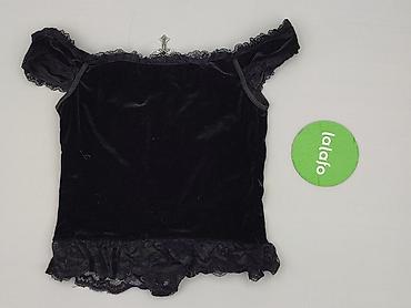 Czarny, koronkowy top damski M.B.21 Collection, rozmiar S/M. - Fason: bez rękawów, dopasowany, okrągły dekolt z ozdobną wstawką z połyskiem przy krawędzi. - Materiał: ażurowa koronka o gęstym, dek...