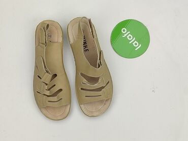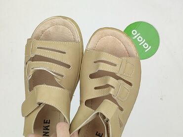 Beżowe sandały damskie na koturnie - Model: odkryte palce, odkryta pięta, pasek ze sprzączką - Materiał: naturalna skóra (cholewka i wkładka – oznaczenia skóra wewnątrz) - Podeszwa: koturna z fakt...Stan: