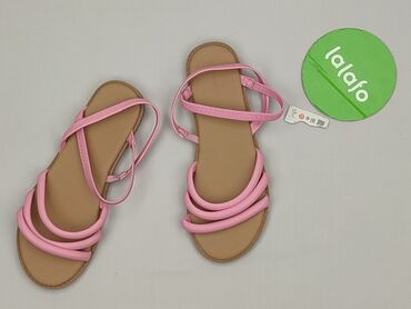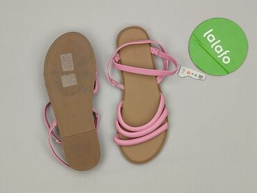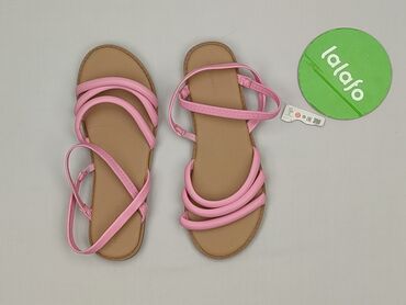 Sandały damskie na płaskiej podeszwie, rozmiar 39. - Kolor: jasny liliowy/pudrowy lawendowy - Model z odkrytymi palcami, pasek z przodu ozdobiony dużym, złotym łańcuchem - Zapięcie na regulowany p...